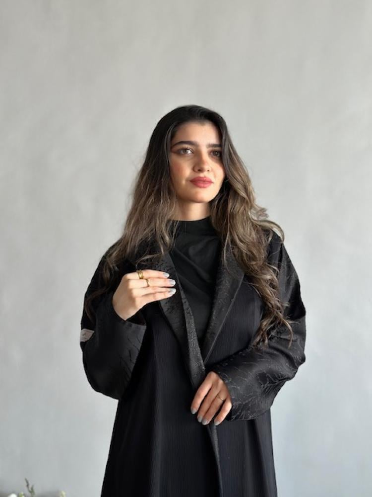 - عباية لف سوداء بتصميم أنيق وعصري مع تفاصيل مشجرة لامعة تضفي لمسة فاخرة.